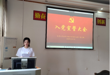 会议伊始,首先全体起立庄严奏唱国际歌,支部书记张毓芯宣读新发展的预备党员名单。本次太阳成集团tyc151cc学生第一党支部共接收了6位预备党员,党员同志贾芳芳同志带头宣誓,大家一起宣誓庄严肃穆声音洪亮。短短80个字,是怀揣初心站在新起点的他们对党的庄严承诺,是担起使命。