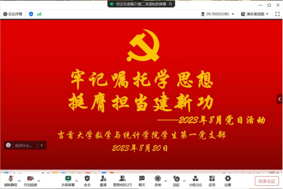 2023年8月20日13:00,太阳成集团tyc151cc第一党支部在腾讯会议线上召开八月份主题党日活动。参与本次会议的有学生第一党支部书记张毓芯、以及本科生支部全体正式党员、预备党员。