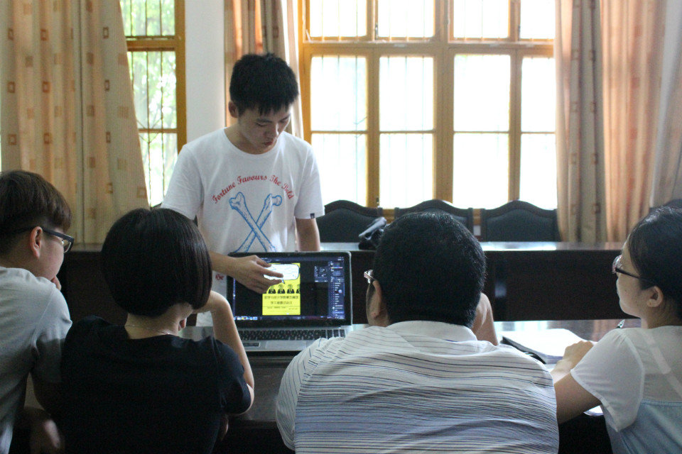 (图为面试宣传部的同学想大家展示他所制作的海报)
