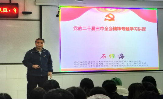 (通讯员莫凡琼)为深入学习贯彻党的二十届三中全会精神,用党的新精神引领青年学生思想,深入理解和把握全会的精神和要义。11月26日晚,我院在60415开展“党的二十届三中全会精神专题学习讲座”。本次宣讲由石维海老师主讲,研究生党支部书记贺永芳主持,我院所有在校学生党员、预备党员、发展对象及下半年发展的积极分子等160余人参加了学习。