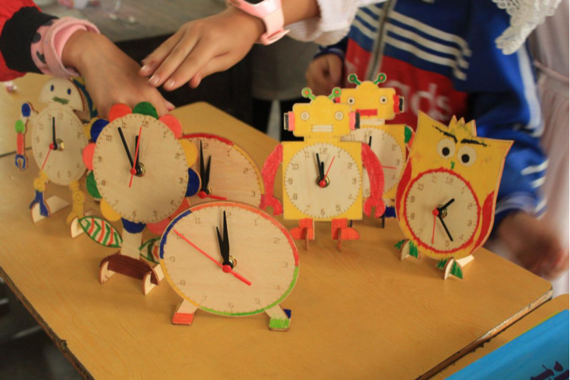 “老师老师,你看我做得怎么样啊?”“老师老师,我们今天上什么课,要学什么呢?”正是这句句无邪、好学的话语戳动着队员们的心房,孩子们开心的笑颜即是对团队成员最好的回报。课堂上,孩子们争先恐后举手发言,讲述着自己的所闻所见与所感。成员们通过课堂讲解、手工制作、与时钟合影等多样的互动形式,激发孩子们动手能力,指引孩子时间观念的初步建立,使他们感受到美好未来生活应建立在良好的时间管理上。