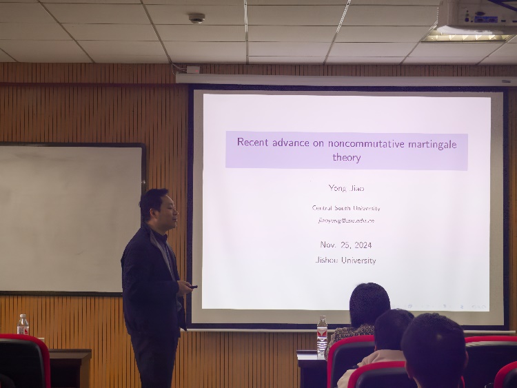 (本网讯 通讯员 王花蝶报道)2024年11月25日上午,总理楼学院学术报告厅60605室座无虚席,中南大学焦勇教授莅临我院讲学,他主讲座的题目是“Sone recent progress on noncommutative martingale theory”。学院部分领导及研究生导师、研究生聆听了此次学术讲座。院党委书记吴湘军主持。