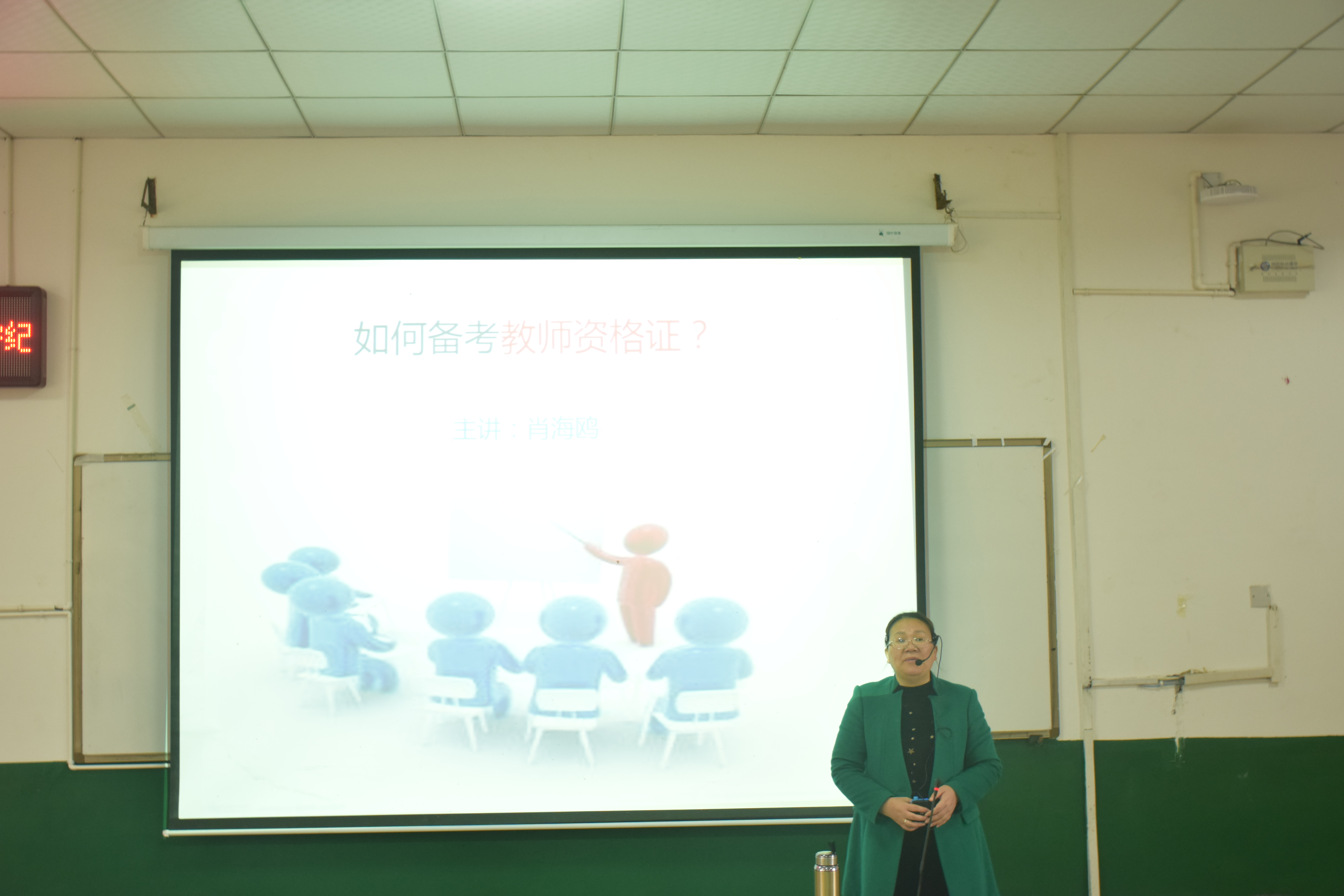 在本次专题讲座中,肖老师声情并茂地向我们介绍了有关教师资格证考试的基本内容。她着重强调了,教师资格证对于师范生的重要性和必要性。接着,她谈到“人民教师是一份光荣的职业,现在对教师各方面素质的要求越来越高。”她鼓励我们在日常学习生活中要严于律己,修行良好的品格,拓展各领域的知识技能。